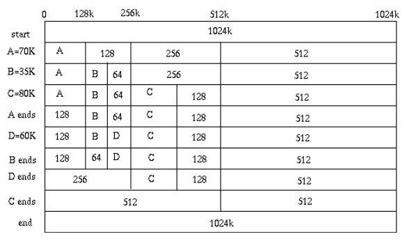 后面的,B,C,D都这样,而释放内存时,则会把相邻的块一步一步地合并起来(合并也必需按分裂的逆操作进行合并)。