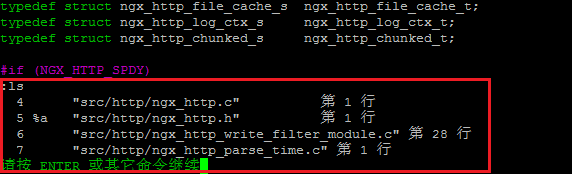 你可以看到Vim打开了四个文件,编号是4,5,6,7,如果你要切换打开的文件,这个时候,你不要按回车(按了也没事,只不过按了就看不到:ls输出的buffer列表了),你可以使用下面的命令切换文件(buffer后面的4表示切到4号文件也就是src/http/ngx_http.c):