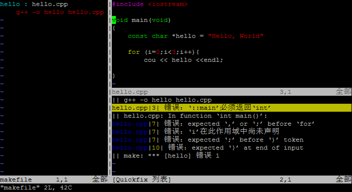 假如我们有一个hello.cpp文件和一个makefile,于是我们可以直接在vim下输入 :make , 于是就可以make这个hello.cpp文件,如果出错了,我们需要按回车返回,这个时候,我们可以使用下面的命令来把出错显到在vim的分屏中: