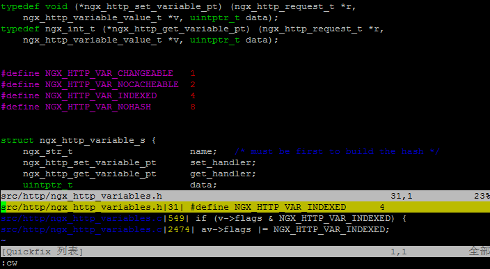 上面这个命令意思是递归查询src目录下所有的.c和.h文件,其中包括NGX_HTTP_VAR_INDEXED宏。然后,你就会看到vim到shell里去执行并找到了相关的文件,按回车返回vim后,别忘了用 【:cw 】把grep的输出取回来,于是我们就有下面的样子: