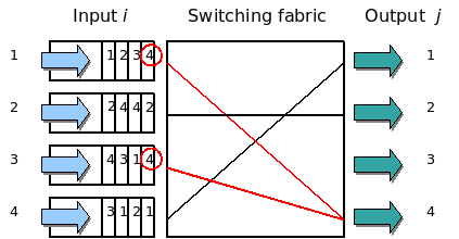这个问题又叫Head-of-Line Blocking问题,这也是一个比较经典的流量调度的问题。这个问题最早主要的发生的交换机上。下图来自Wikipedia。