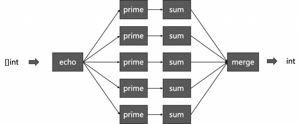 sum(prime(in)),于是每个Sum的Go Routine都会开始计算和 - 最后再把所有的结果再求和拼起来,得到最终的结果。