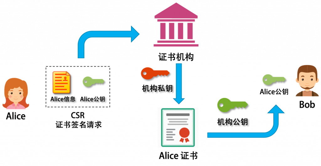 3. CA 机构会来找 Alice 做物理世界的认证,如果通过后,就会用自己的机构私钥,把CSR 变成一个签名证书。