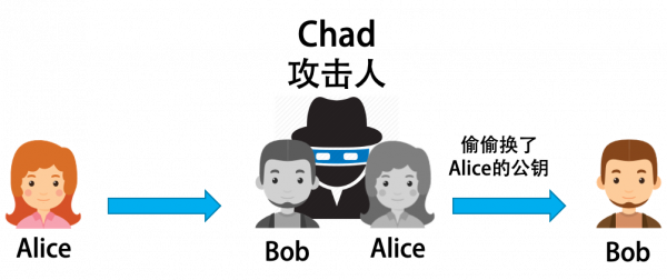 中间人 Chad 把自己伪装成 Bob 向 Alice 要信息,然后,再伪装成 Alice 对 Bob 说,这就是 Alice 的公钥,于是 Bob 也无法验证是不是 Alice 的公钥,因为公钥里就是一堆乱七八糟的数据,我们完全不能分辨哪个公钥属于 Alice 的。试想,如果我们收到声称属于银行的密钥。我们怎么知道它确实属于你的银行?