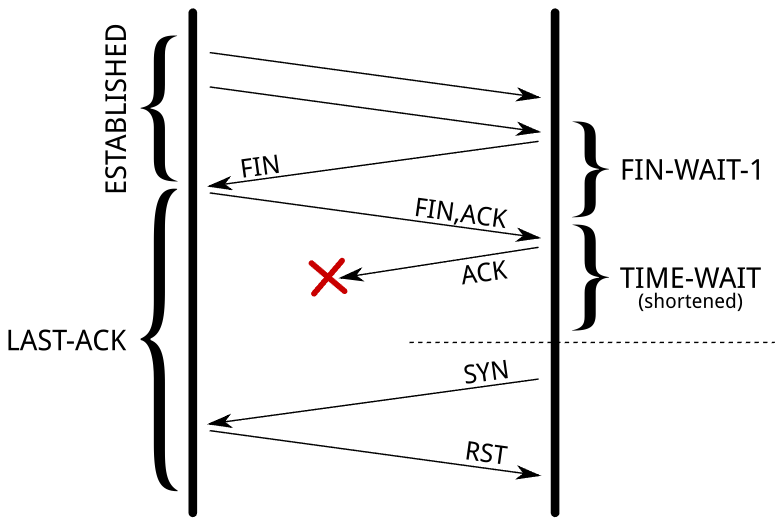 2)另一个目的是确保远端已经关闭了连接。当最后一个ACK 丢失时,对端保持该LAST-ACK状态。在没有TIME-WAIT状态的情况下,可以重新打开连接,而远程端仍然认为先前的连接有效。当它收到一个SYN段(并且序列号匹配)时,它将以RST应答,因为它不期望这样的段。新连接将因错误而中止: