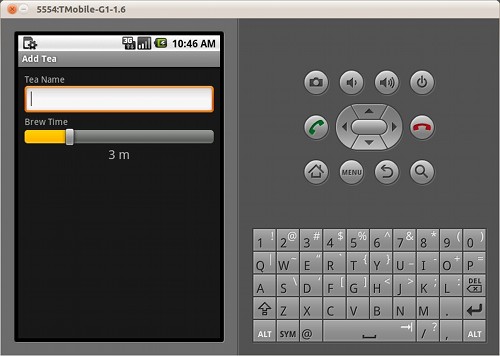 在模拟器中运行你的程序,按下“Menu”按键,点击屏幕上的“Add Tea”。试图通过在此按下“Menu”和点击屏幕的 “Save Tea.”来保存空茶叶名的茶叶数据。由于是没有茶叶名,一条错误消息将出现在你的面前: