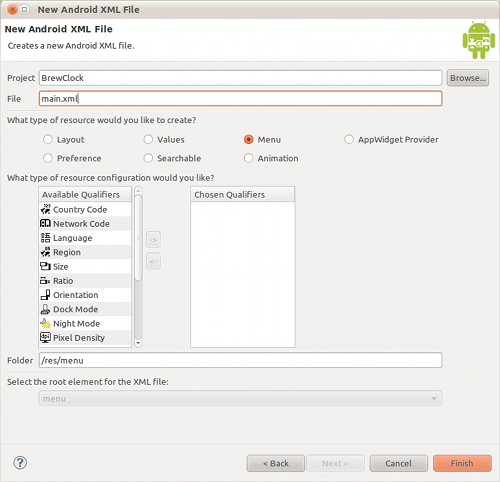 Open the res/menus/main.xml file, and switch to XML view by clicking the “main.xml” tab along the bottom of the window.