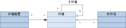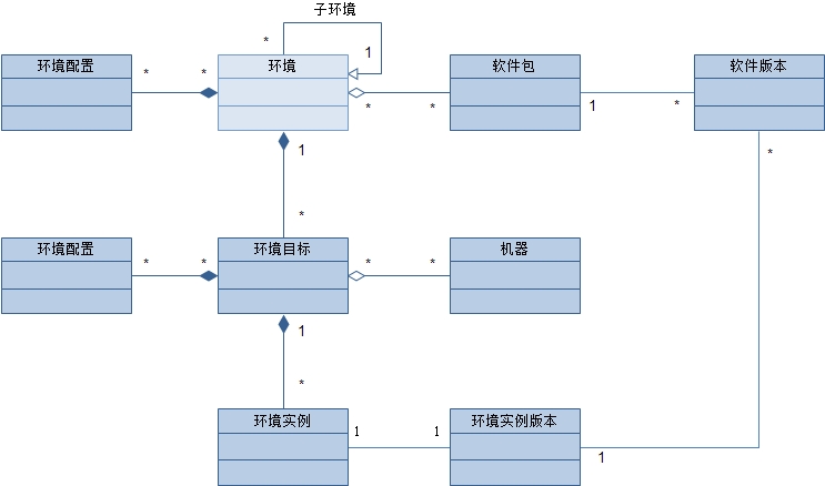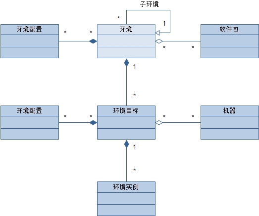 这里,环境依然是处于知识层面(Knowledge Level),它并未与具体的基础设施相关联。当我们将一个环境“具现化”成一个运行系统时,我们就产生了一个真正的环境实例。在这两者之间,我们还必须要考虑环境实例的使用目的(开发?测试?……)以及安装所依赖的其它信息(如机器),因此,我们需要增加一个环境目标来集中这些信息,而且由于不同目标的环境可能会有所差别,因此,环境目标也需要配置的能力。概念模型如图: