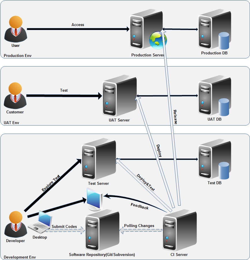 这几年,持续集成随着敏捷在国内的推广而持续走热,与之相伴的持续部署也一直备受关注。自前两年,持续交付这个延续性概念又闯进了国内IT圈,慢慢开始在社区和会议中展露头角。许多不明真相的群众跟风哭着喊着要“上”,而许多前CI的半吊子玩家换件衣服就接着干,有的甚至衣服都来不及换……。国内的这些土财主如果不巧请了某些所谓的战略家,除了建了一堆持续集成环境,以及每天嚷嚷着要这个要那个,混乱的状况在根本上没有得到改善。本文无意费力探讨持续集成和持续交付的概念,而是打算谈谈对于大型软件企业,以持续集成为基础实现持续部署(交付)时,所要面对的问题以及可行的解决方案。地主老财们,夜黑风正猛,山高路又远,注意脚下……