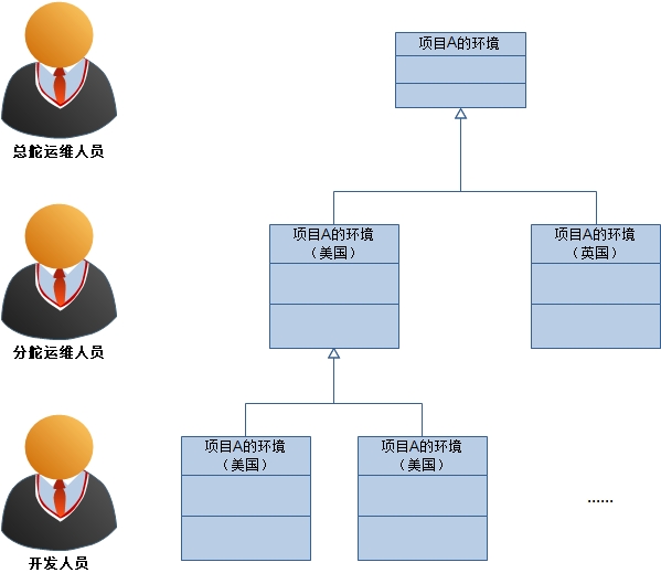 再回头审视我们的示例,项目A的生产环境可以部署在不同的区域,对于各个区域可能有定制化的设定。这就像面向对象中的类,可以通过继承使子类重用父类的公有属性和行为并添加自己特有的信息。因此,环境的概念模型如图: