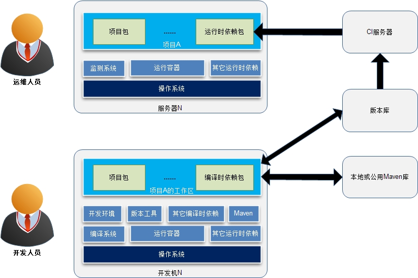 简单项目中,开发环境和运行环境都由开发人员搭建,当公司变大时,系统的运行环境将由运维人员搭建,而开发环境如果由运维人员搭建则工作量太大,由开发人员自己搭建则操作复杂又容易产生不一致的情况。
