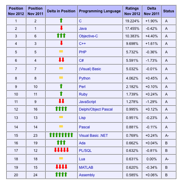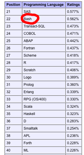 • 每个月tiobe上都会给一个编程语言的排名,来显示各种语言的流行度。排名指数综合了全球范围内使用该语言的工程师人数、教学的课程数和第三方供应商数。截止至2012年11月份,tiobe公布的编程语言排行榜里,bash的指数是0.56%排名22位。如果算上它旗下的awk 0.21%和tcl 0.146%,大概就能排到14名。注意这里还不包括bash的同源的兄弟姐妹csh、ksh等,算上它们,shell家族有望接近前十。值得一提的是一直以来shell的排名就很稳定,不像某些“暴发户”语言,比如objective-c,这些语言的流行完全是因为当前Apple系的崛起,但这种热潮极有可能来得快去得更快。