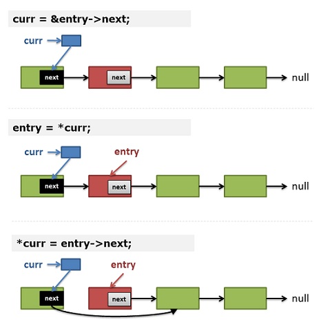 People who understand pointers just use a “pointer to the entry pointer”, and initialize that with the address of the list_head. And then as they traverse the list, they can remove the entry without using any conditionals, by just doing a “*pp = entry->next”. (了解指针的人会使用链表头的地址来初始化一个“指向节点指针的指针”。当遍历链表的时候,可以不用任何条件判断(注:指prev是否为链表头)就能移除某个节点,只要写)