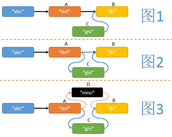 - 然后新建一个节点C,并使其next指针指向节点B。(见图1)
