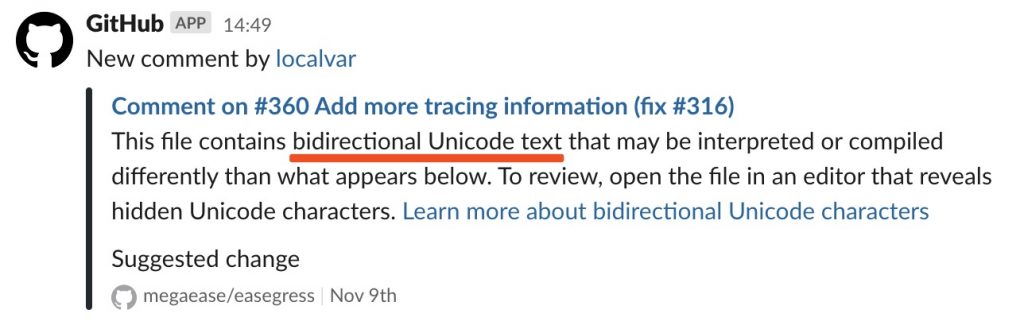 最近,我们在 Github 的 Code Review 中看到 Github 开始出现下面这个 Warning 信息—— “This file contains bidirectional Unicode text that may be interpreted or compiled differently than what appears below.”也就是说我们的代码中有一些 bidirectional unicode 的文本,中文直译作 “双向文本”,意思是一些语言是从左到右的,而另一些则是是从右到左的(如:阿拉伯语),如果同一个文件里,即有从左向右的文本也有从右向左文本两种的混搭,那么,就叫bi-direction。术语通常缩写为“ BiDi ”或“ bidi ”。使用双向文本对于中国人来说并不陌生,因为中文又可以从左到右,也可以从右到左,还可以从上到下。