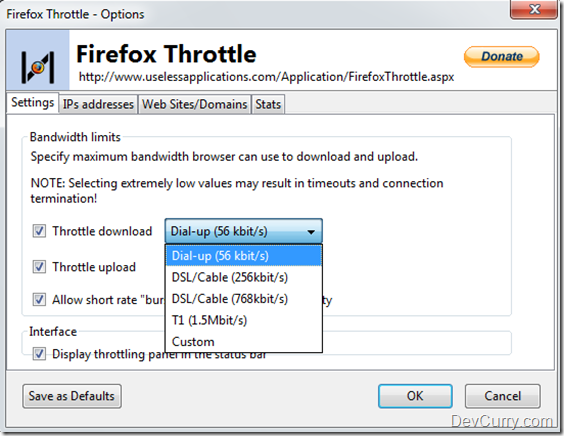 目前有很多工具能够模拟慢速网络,值得一提的是 Firefox Throttle,这是一个 Firefox 插件,你可以设置上载和下载的数率,并且监控当前带宽的使用情况。另一个非常有用的特性是它可以控制你的 localhost 的连接数率,对本地测试很有用。